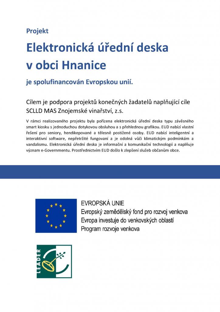 V rámci realizovaného projektu byla pořízena elektronická úřední deska typu závěsného smart kiosku s jednoduchou dotykovou obsluhou a s přehlednou grafikou. EUD nabízí vlastní řešení pro seniory, hendikepované a tělesně postižené osoby. EUD nabízí inteligentní a interaktivní software, nepřetržité fungovaní a je odolná vůči klimatickým podmínkám a vandalismu. Elektronická úřední deska je informační a komunikační technologií a naplňuje význam e-Governmentu. Prostřednictvím EUD došlo k zlepšení služeb občanům obce.