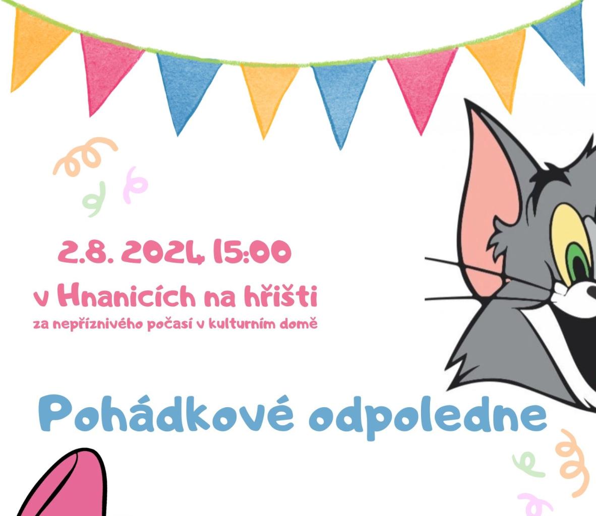 Přijďte se v pátek 2.8.2024 pobavit a užít si prázdninové odpoledne. Od 15:00 hodin na vás na hřišti v Hnanicích čekají postavičky v maskách, skákací hrad, malování na obličej, soutěže s odměnami a občerstvení. V případě nepříznivého počasí se akce koná v kulturním domu.