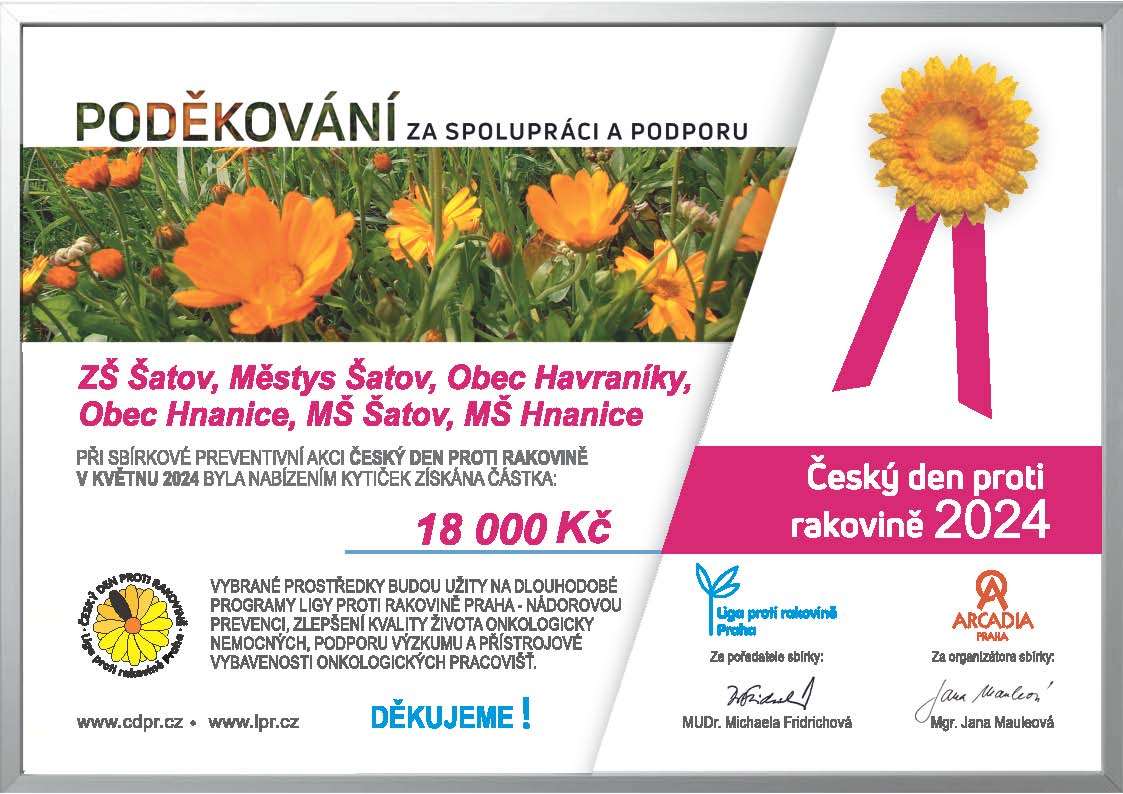 Prodáno bylo 450 kusů kvítku měsíčku lékařského s celkovým výtěžkem 18 000,- Kč, který byl odeslán na konto Ligy proti rakovině. Průměrná hodnota jedné kytičky byla dvojnásobná a to 40,- Kč.