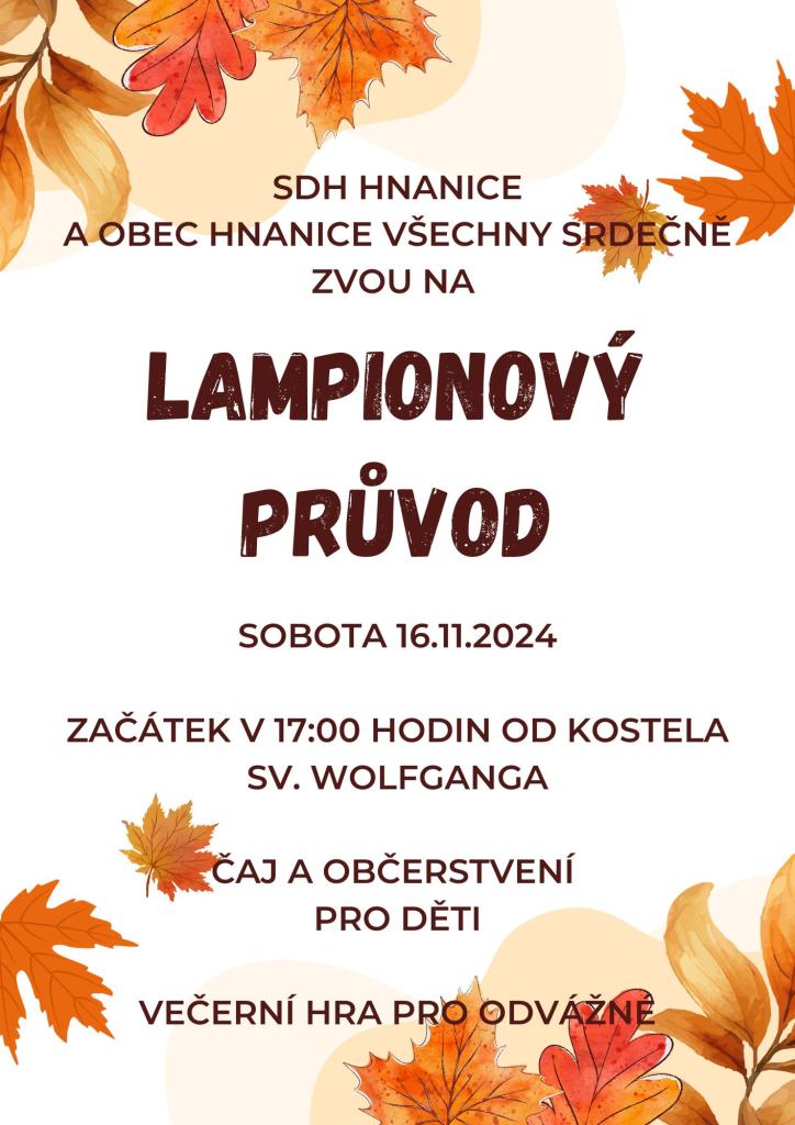 V sobotu 16.11.2024 se od 17:00 hod. uskuteční lampionový průvod, se začátkem u kostela sv. Wolfganga. Sraz v 16:40 hod., připraven bude čaj a občerstvení pro děti. Pro odvážné se bude konat i večerní hra. Těšíme se na Vás.
