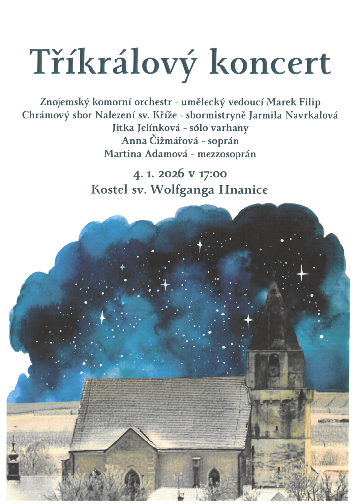 V neděli 4.1.2026 se v kostele sv. Wolfganga v Hnanicích uskuteční od 17:00 hodin Tříkrálový koncert. Vystoupí Znojemský komorní orchestr - umělecký vedoucí Marek Filip, Jitka Jelínková - sólo varhany, Anna Čižmářová - soprán a Martina Adamová - mezosoprán.