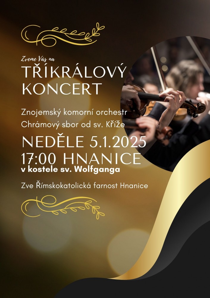 Zveme Vás na tříkrálový koncert, který se uskuteční v neděli 5. ledna 2025 v Hnanicích. V kostele sv. Wolfganga vystoupí Znojemský komorní orchestr spolu s Chrámovým sborem od sv. Kříže. Akce začíná v 17:00 a pořádá ji Římskokatolická farnost Hnanice.
