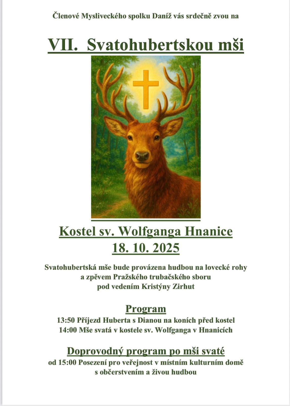 Členové mysliveckého spolku Daníž vás srdečně zvou na mši svatou slouženou ke cti sv. Huberta, patrona myslivců a lesníků. Svatohubertská mše se bude konat v sobotu 18.10.2025 v kostele sv. Wolfganga v Hnanicích od 14:00 hodin. Příjezd Huberta s Dianou na koních ke kostelu je plánován v 13:50 hodin.