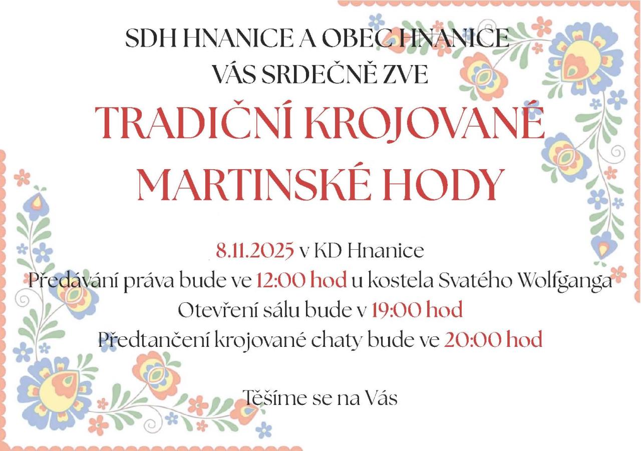 Předávání práva krojované chasy se uskuteční sobotu 8.11.2025 ve 12:00 hodin u kostela sv. Wolfganga v Hnanicích. Od 20:00 hodin se v KD Hnanice uskuteční předtančení krojované chasy, k tanci a poslechu vystoupí skupina Ryan musik.